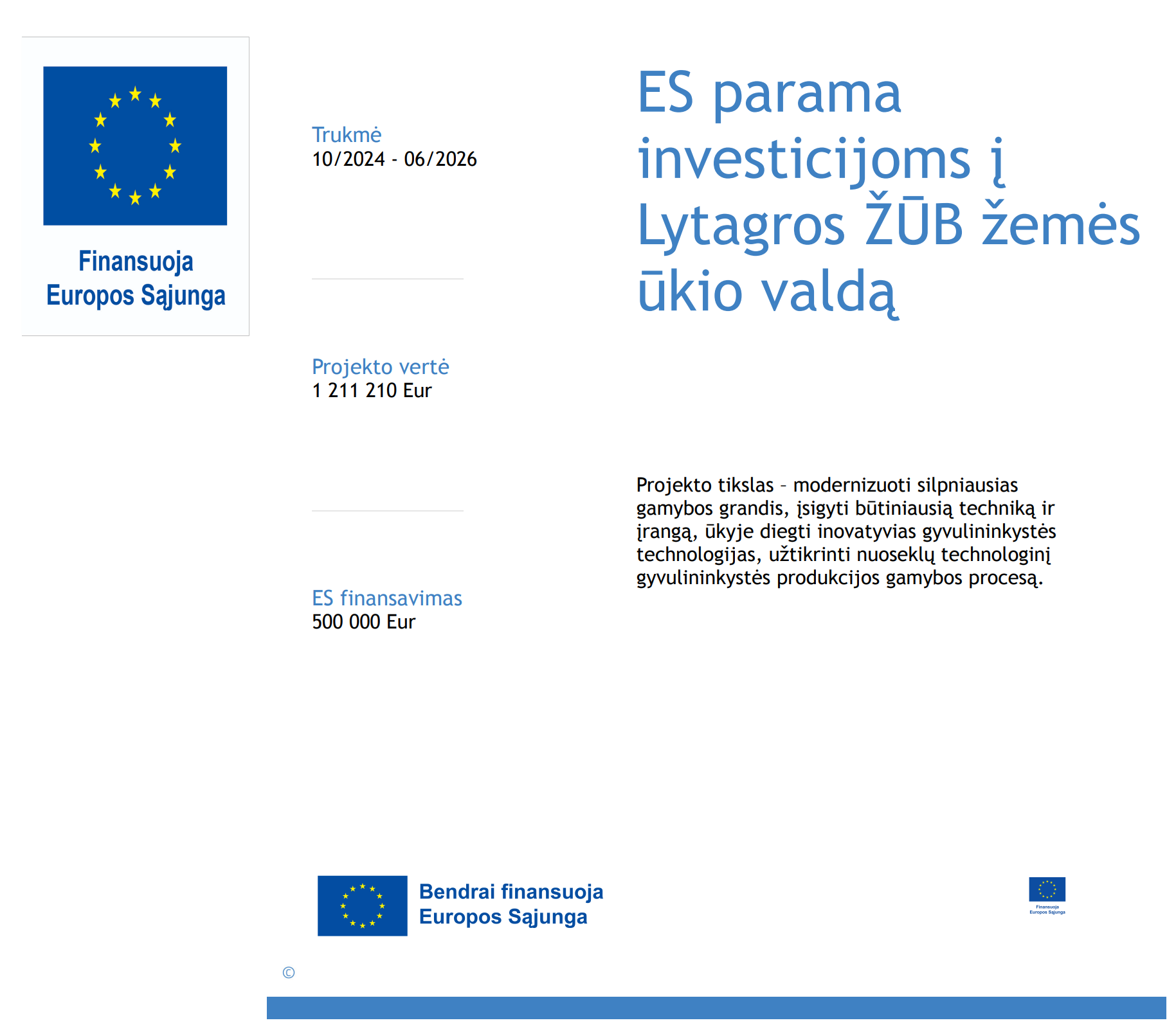 Lytagros ŽŪB vykdo ES lėšomis finansuojamą projektą „ES parama investicijoms į Lytagros ŽŪB žemės ūkio valdą. Paraiškos Nr. 12VM-KK-24-1-05024-PR001.