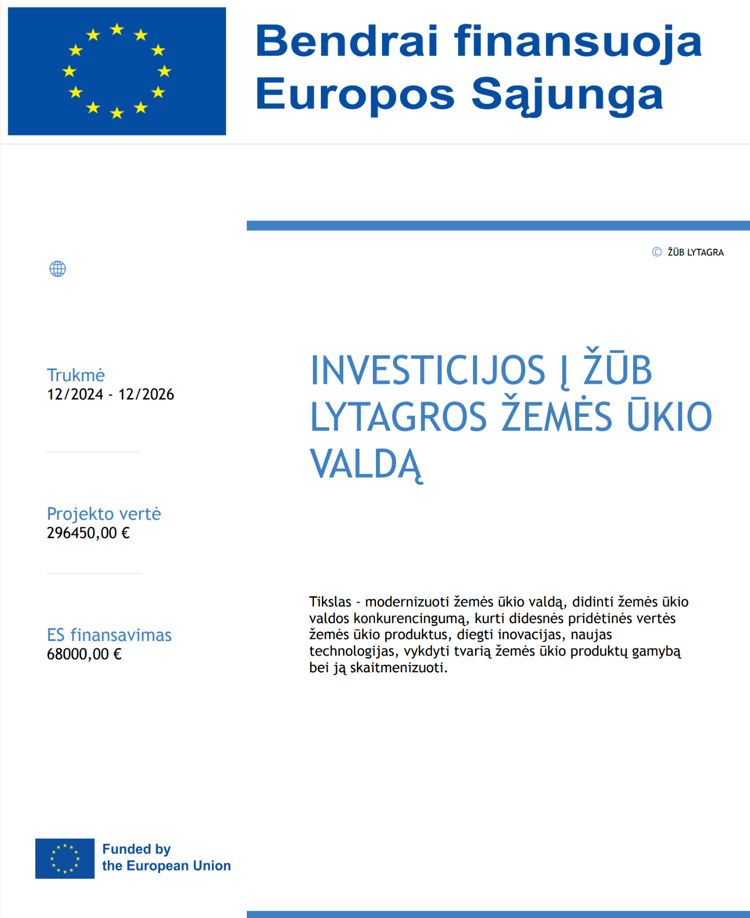 Lytagros ŽŪB vykdo ES lėšomis finansuojamą projektą „ES parama investicijoms į Lytagros ŽŪB žemės ūkio valdą. Paraiškos Nr. Nr. 12VM-KK-24-4-08578-PR001.
